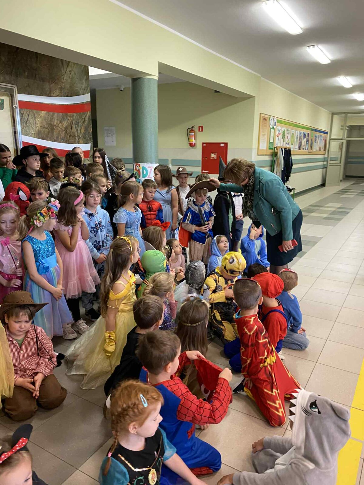 Po czytaniu odbył się barwny korowód bajkowych postaci – uczniowie w pięknych, pomysłowych strojach przemaszerowali po całej szkole. Pochód prowadzili najmłodsi, czyli zerówkowicze, do których po drodze dołączali kolejni przebrani uczniowie.