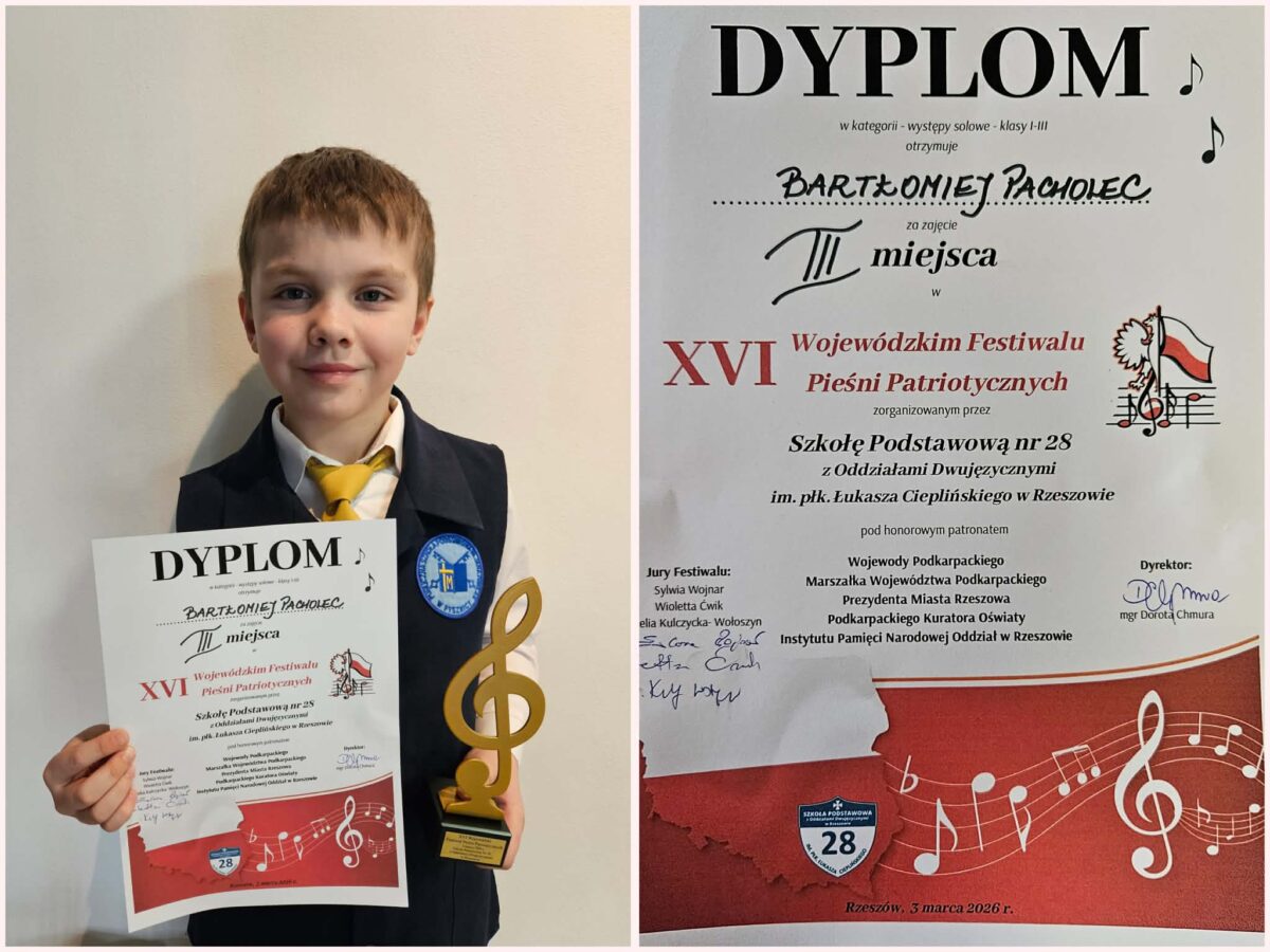 3 marca 2026 roku Bartłomiej Pacholec reprezentował naszą szkołę w Finale XVI Wojewódzkiego Festiwalu Pieśni Patriotycznych, 🇵🇱🇵🇱🇵🇱organizowanego przez Szkołę Podstawową nr 28 im. Łukasza Cieplińskiego w Rzeszowie. Głównym celem festiwalu było uczczenie rocznicy śmierci Łukasza Cieplińskiego oraz jego współtowarzyszy, którzy 1 marca 1951 roku oddali życie za wolną Polskę.