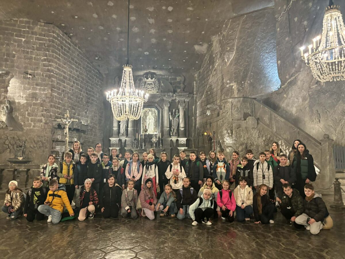 Wycieczka rozpoczęła się od zejścia długimi schodami w głąb ziemi. Podczas zwiedzania uczniowie zwiedzili piękne komory solne, podziemne jeziora oraz niesamowite rzeźby wykonane przez górników. Największe wrażenie na trzecioklasistach zrobiła Kaplica św. Kingi – prawdziwe arcydzieło wykute w soli, wraz z imponującymi żyrandolami. ✨