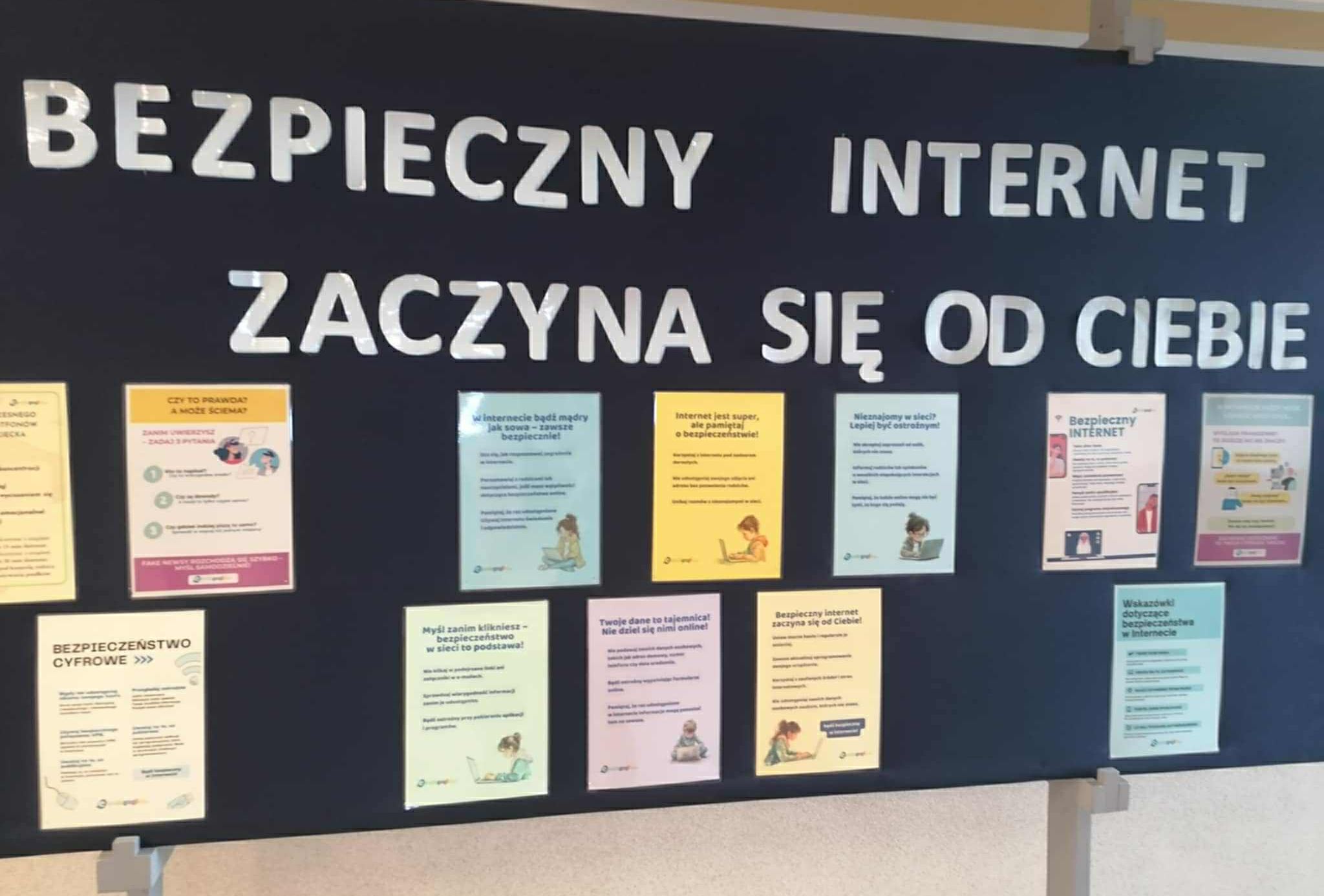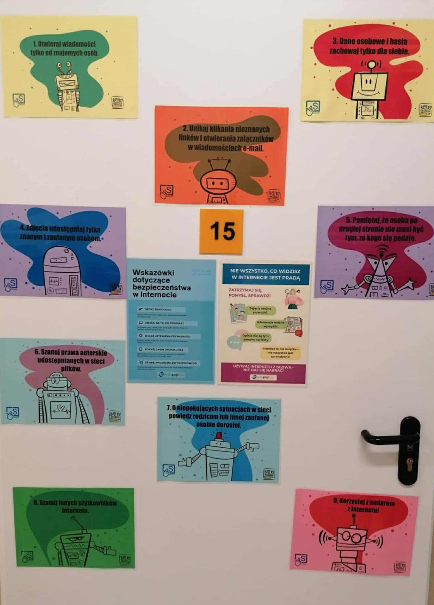 Na drzwiach sal lekcyjnych pojawiły się kolorowe wskazówki dotyczące zasad bezpieczeństwa w Internecie – uczniowie mogli dowiedzieć się m.in., jak chronić swoje dane, reagować na hejt czy tworzyć silne hasła.
