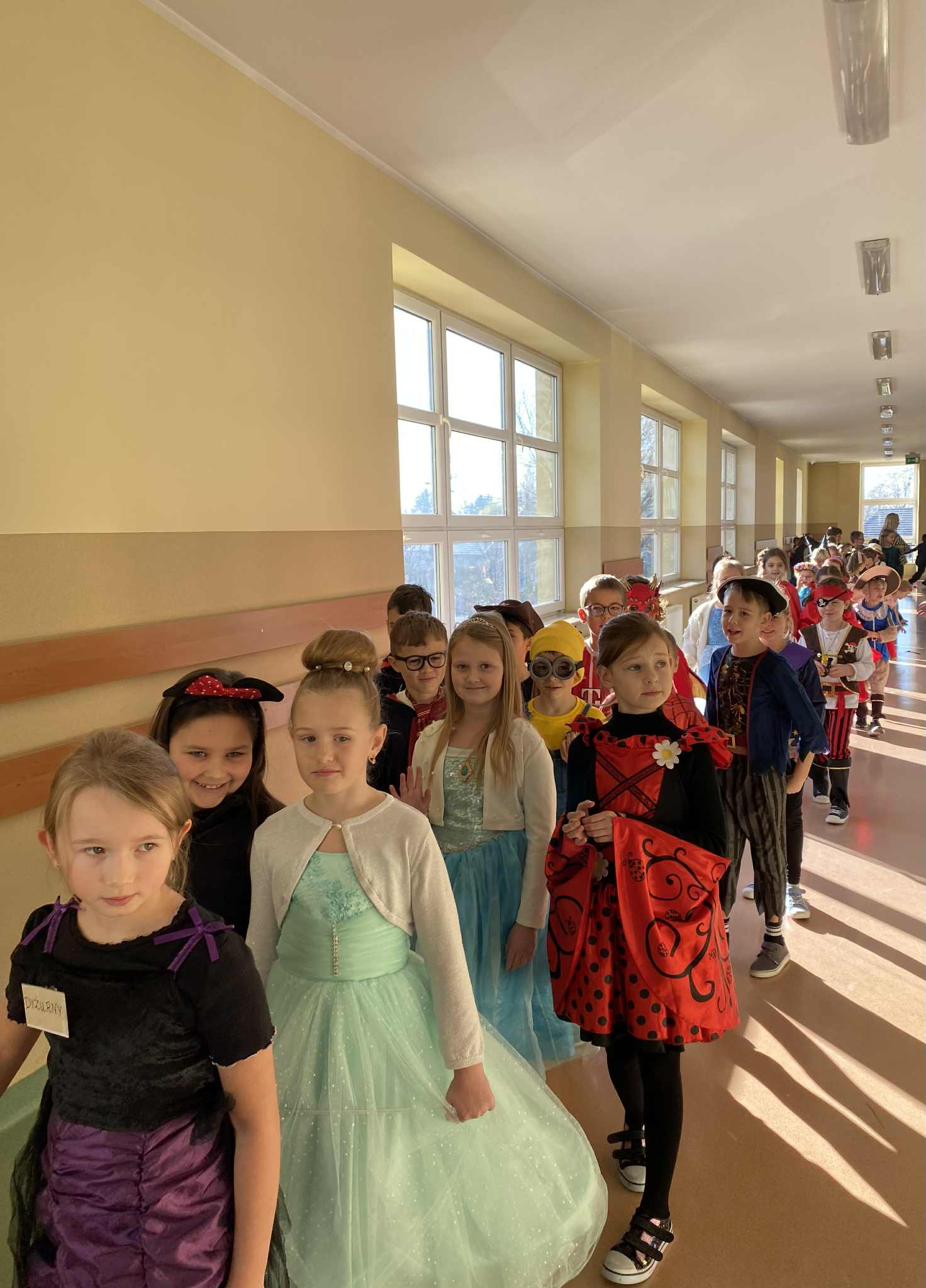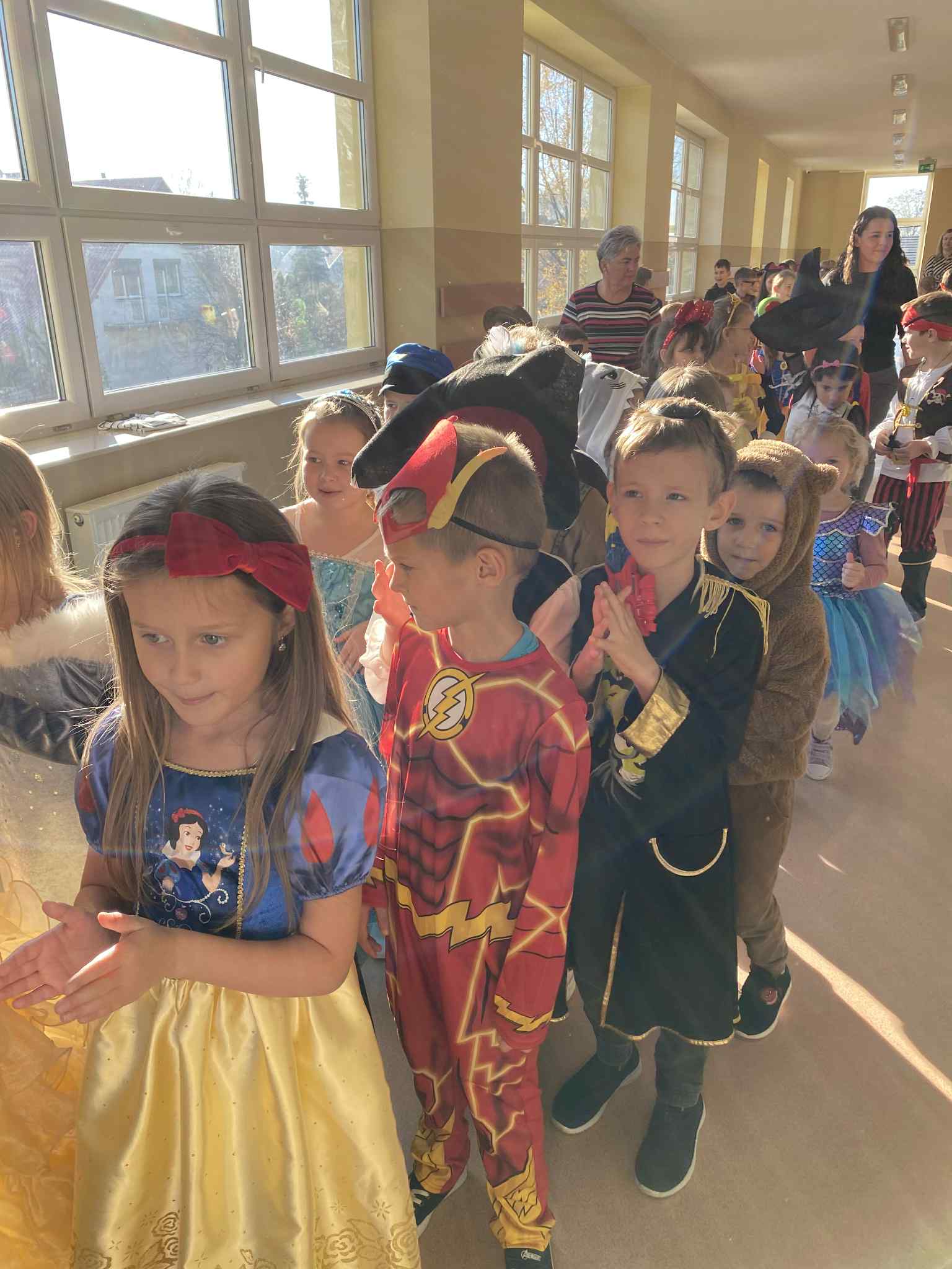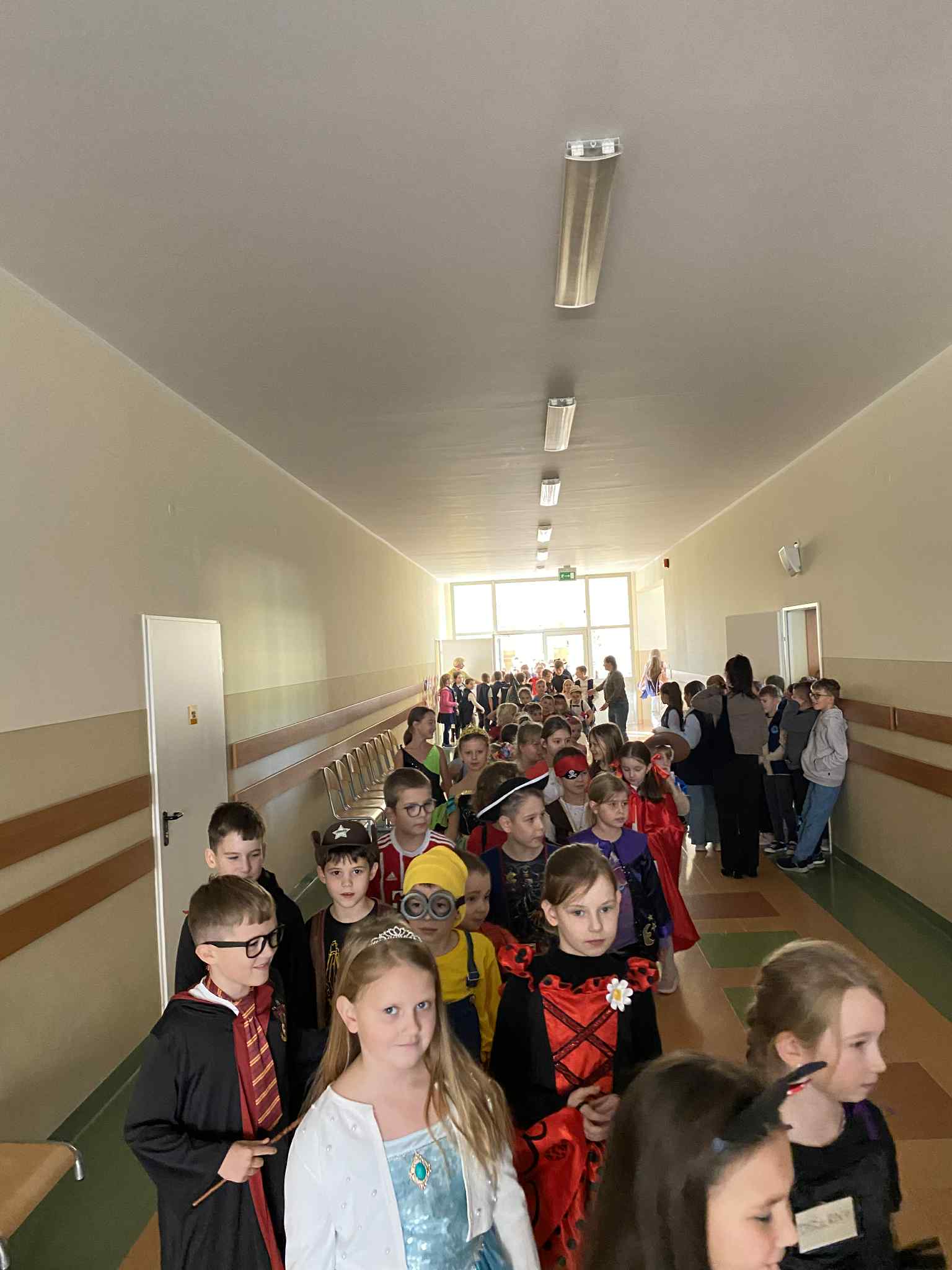 Po czytaniu odbył się barwny korowód bajkowych postaci – uczniowie w pięknych, pomysłowych strojach przemaszerowali po całej szkole. Pochód prowadzili najmłodsi, czyli zerówkowicze, do których po drodze dołączali kolejni przebrani uczniowie.