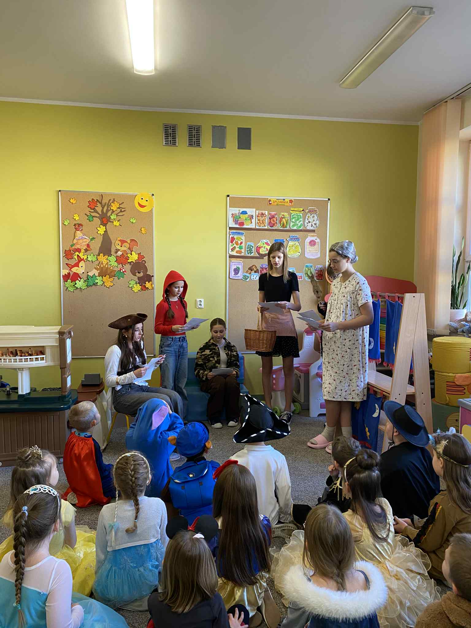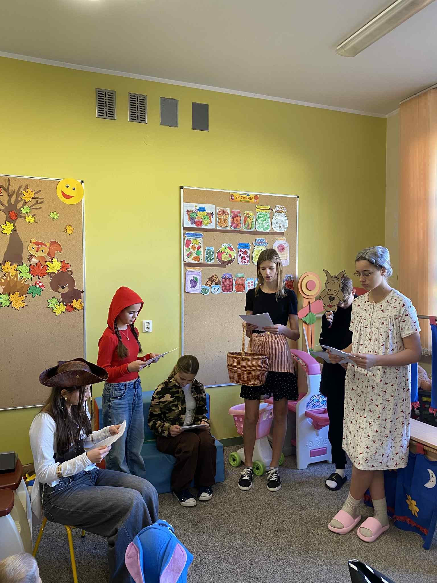 Świętowanie rozpoczęliśmy od wspólnego czytania bajki „Czerwony Kapturek”. Uczniowie klasy ósmej, przebrani za bohaterów tej opowieści, odwiedzili przedszkolaków i czytali im bajkę, wprowadzając najmłodszych w magiczny świat literatury.