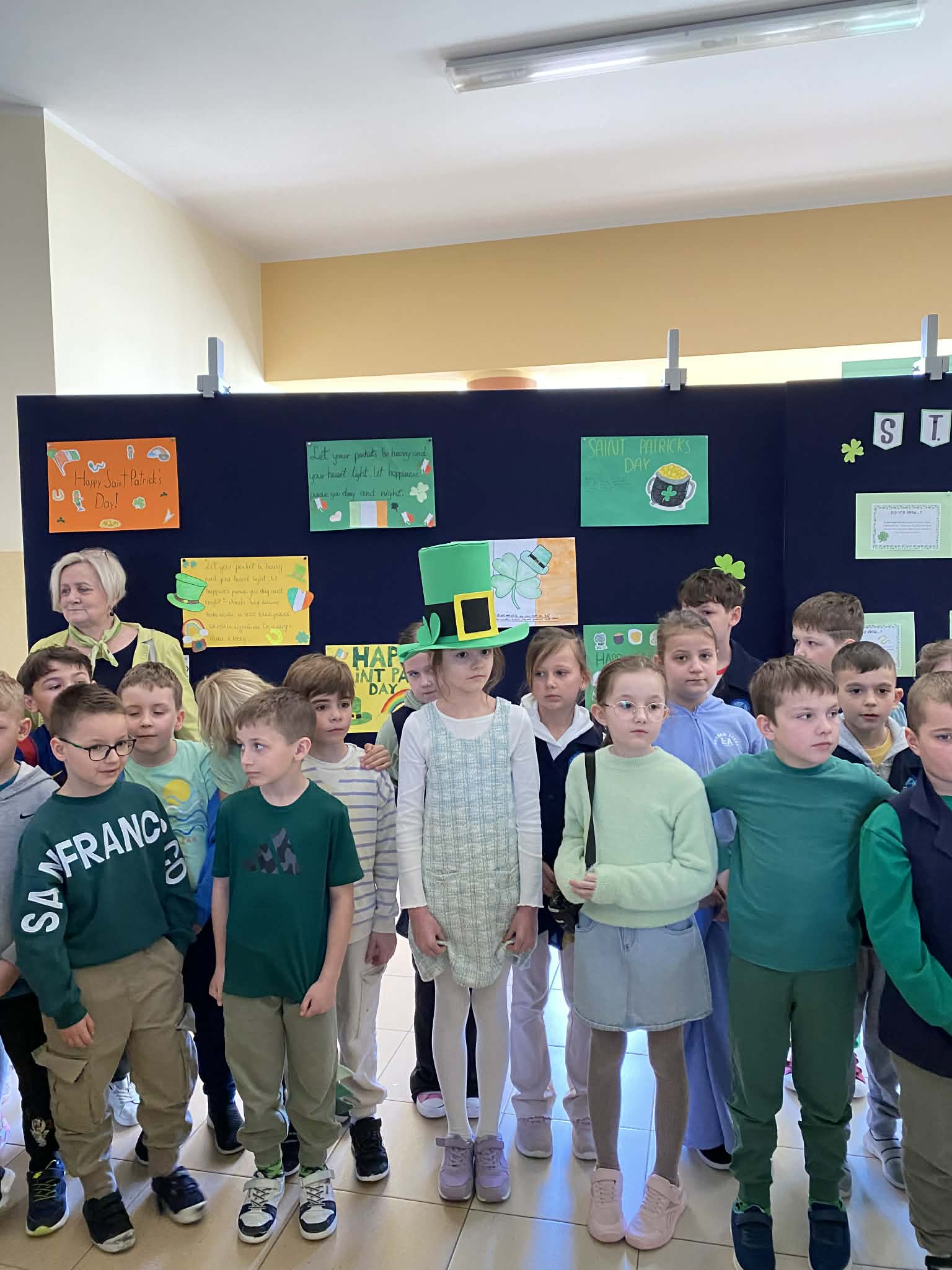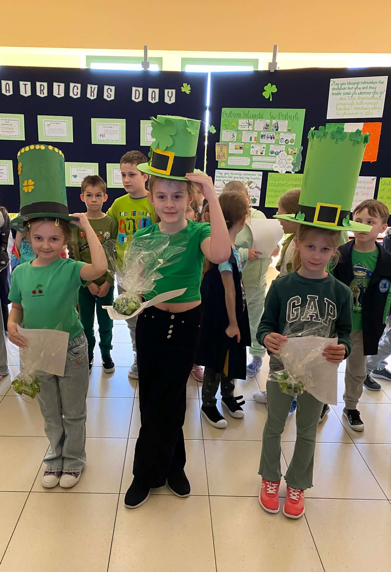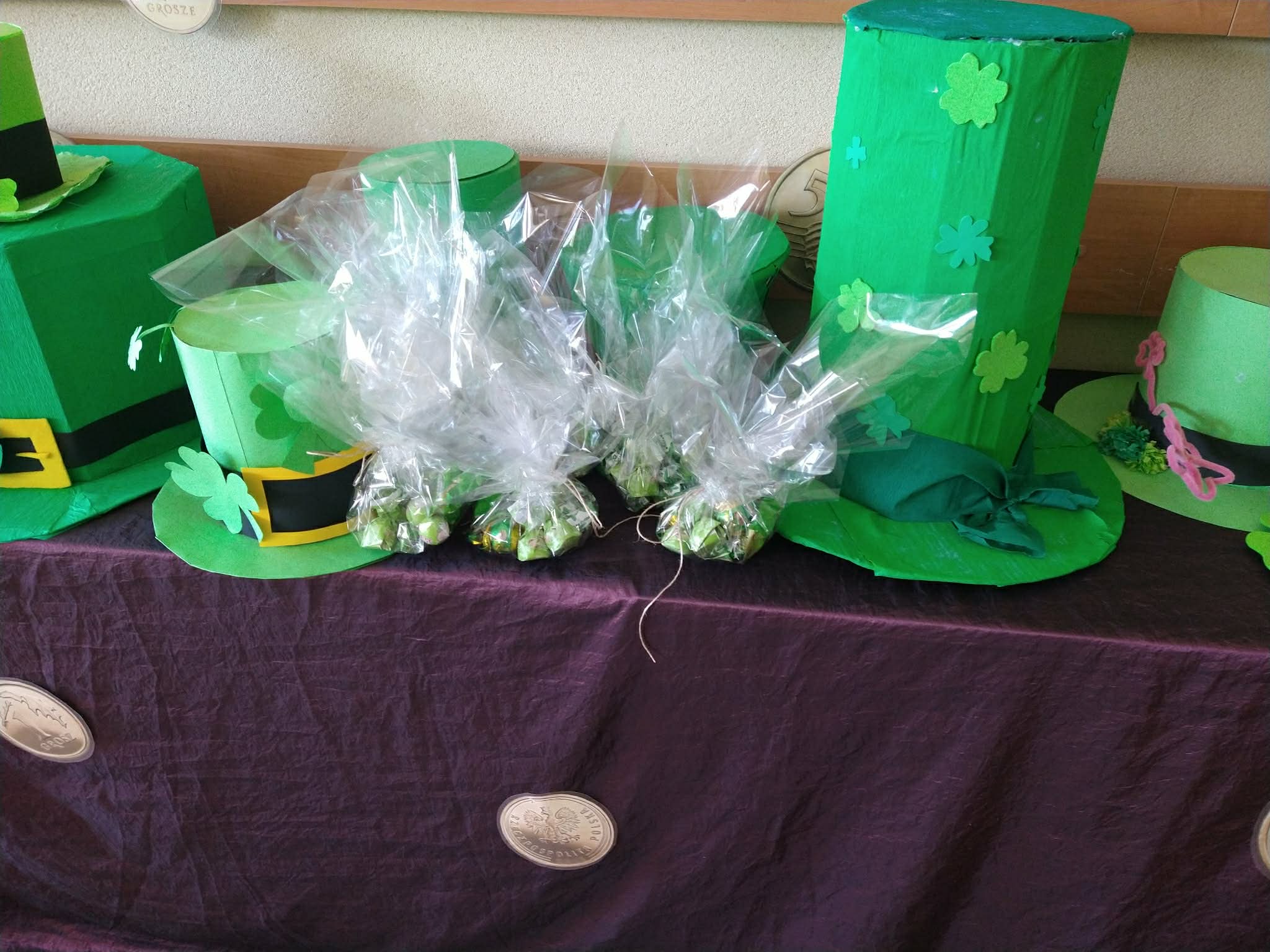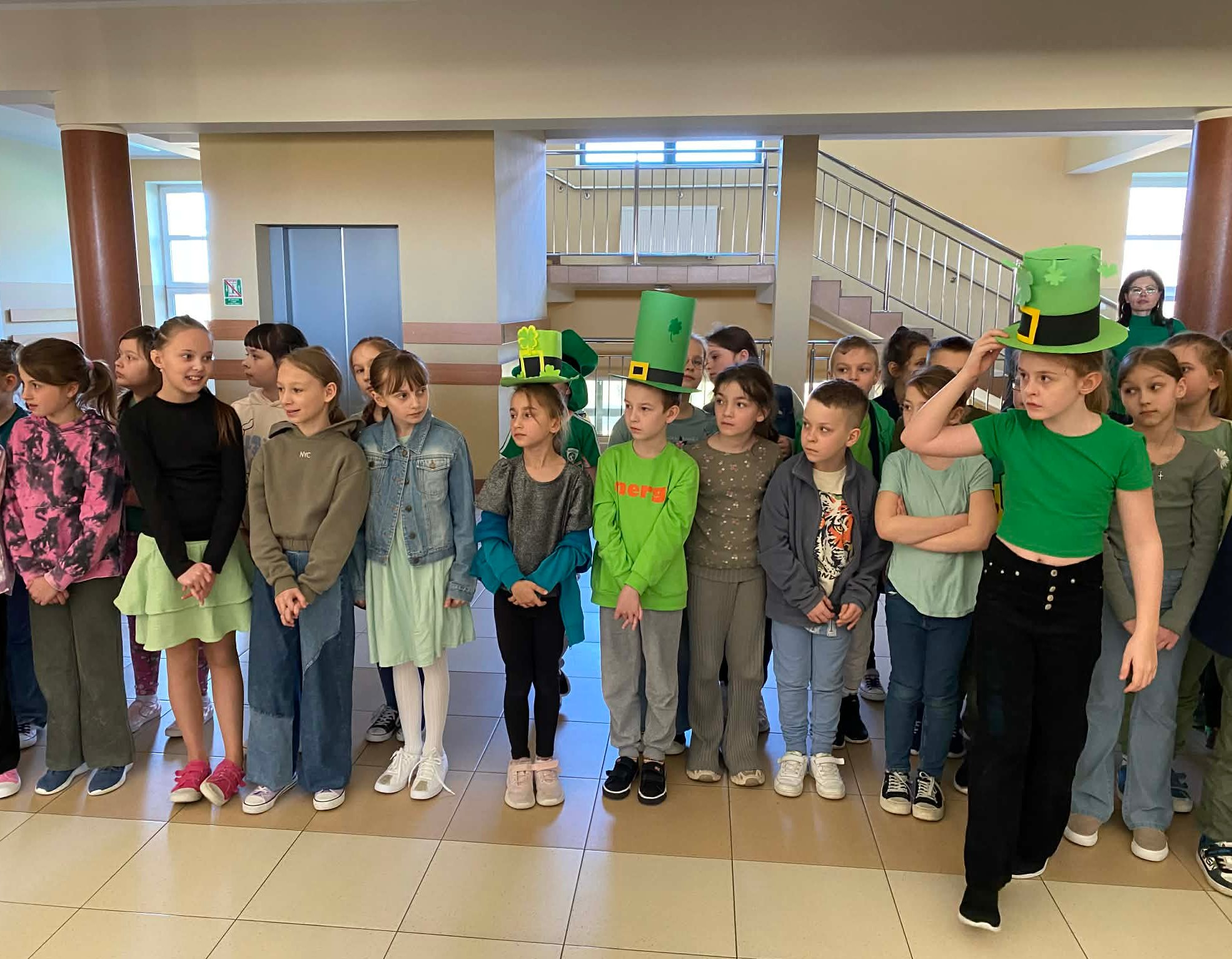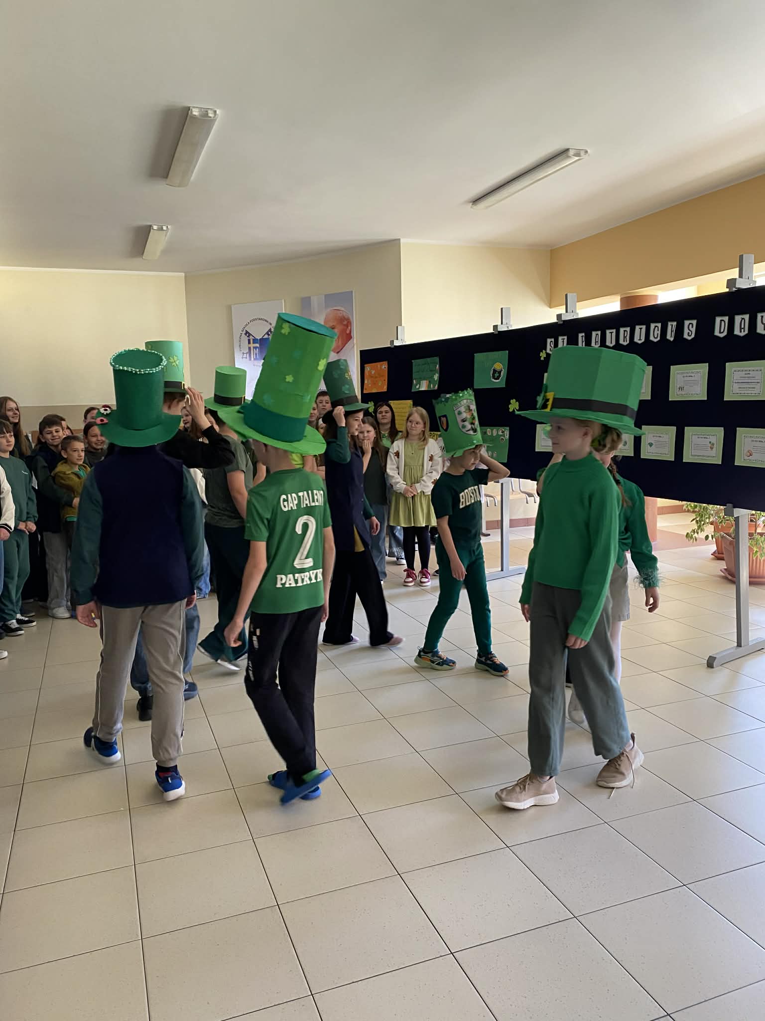 🟩Zorganizowany został konkurs na najpiękniejszy kapelusz skrzata irlandzkiego leprechauna. W rytm muzyki z zielonej wyspy uczniowie z poszczególnych klas prezentowali własnoręcznie zrobione kapelusze. Zwycięzcy konkursu otrzymali słodkie upominki w zielonych kolorach.