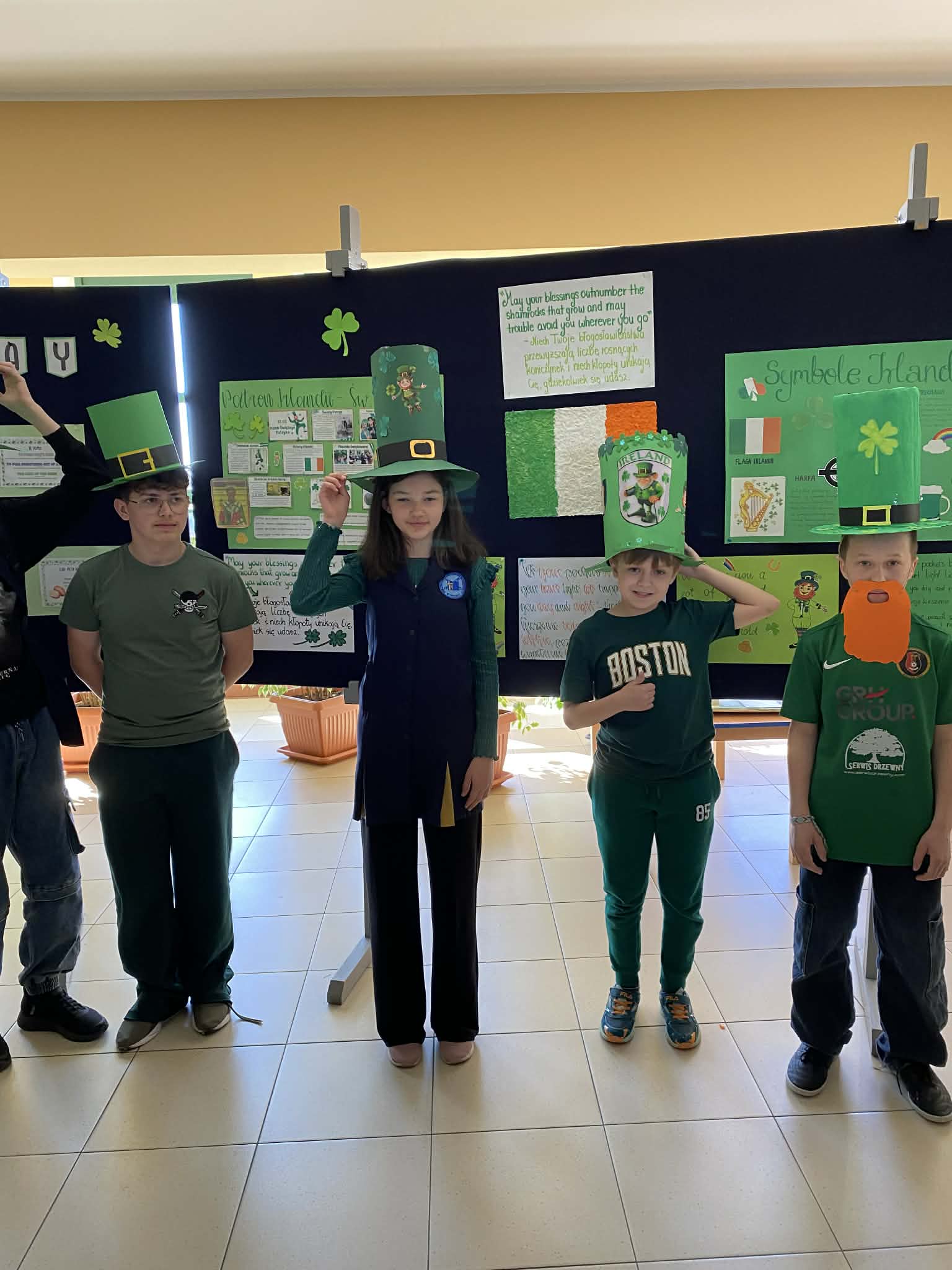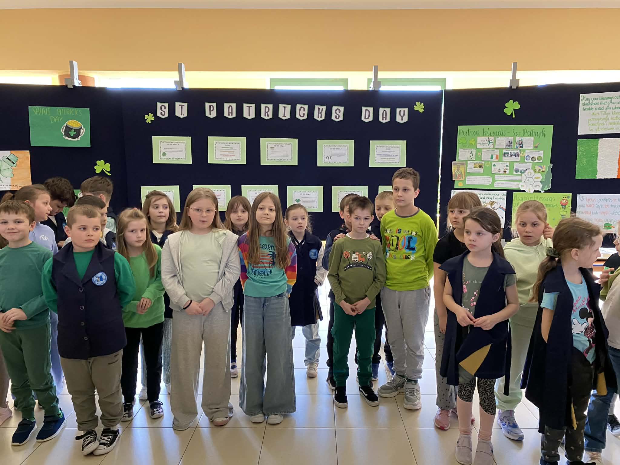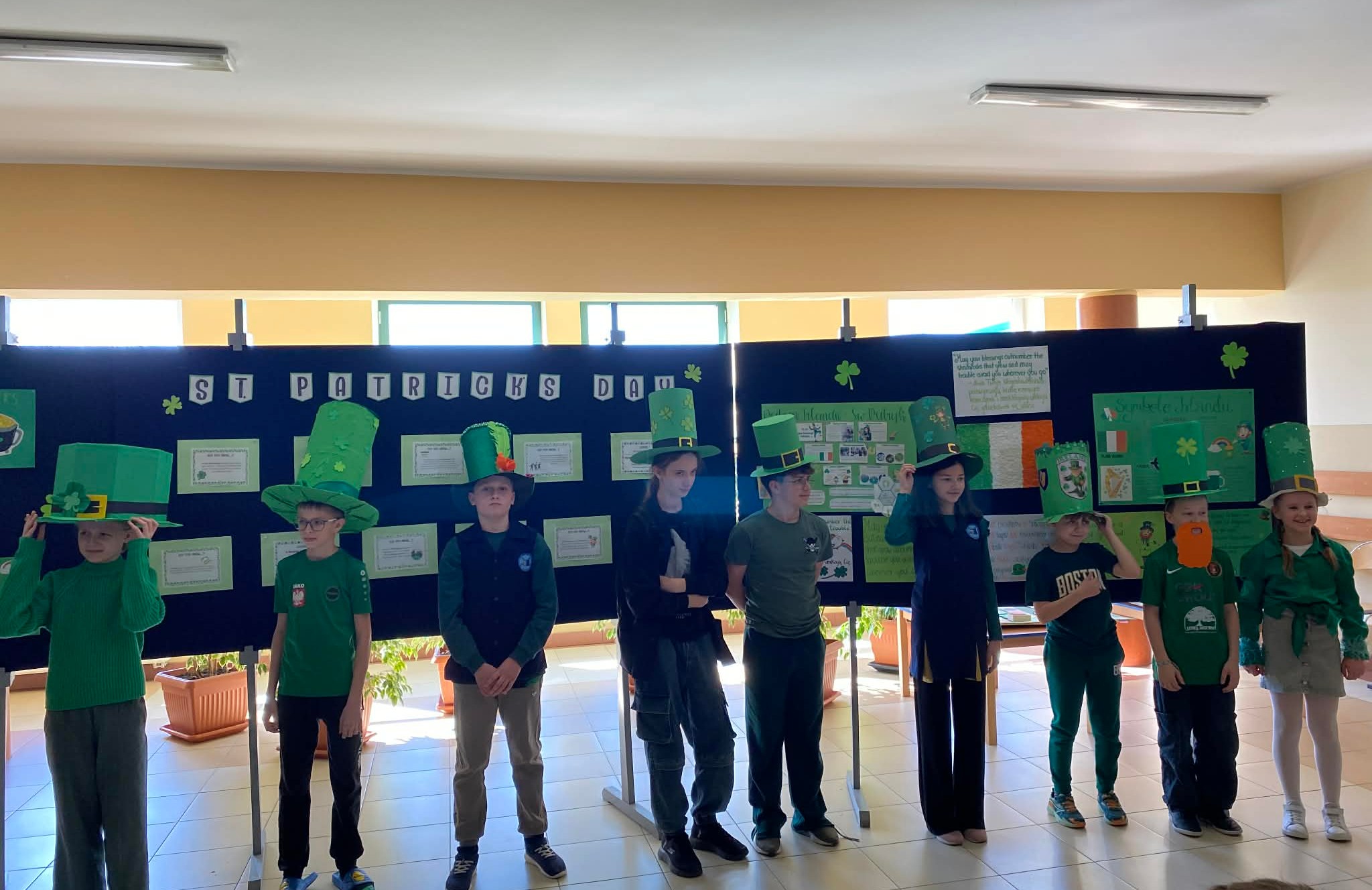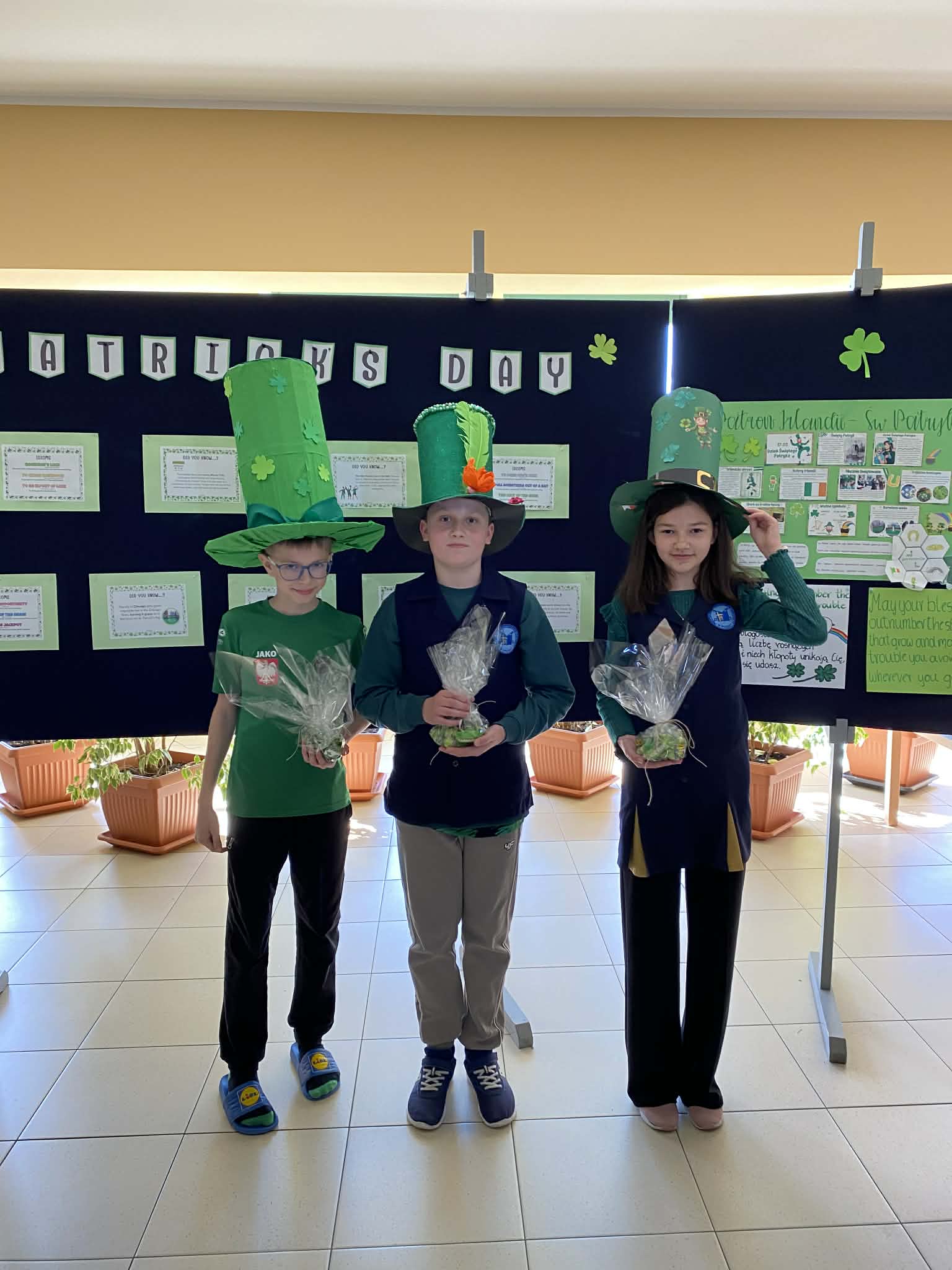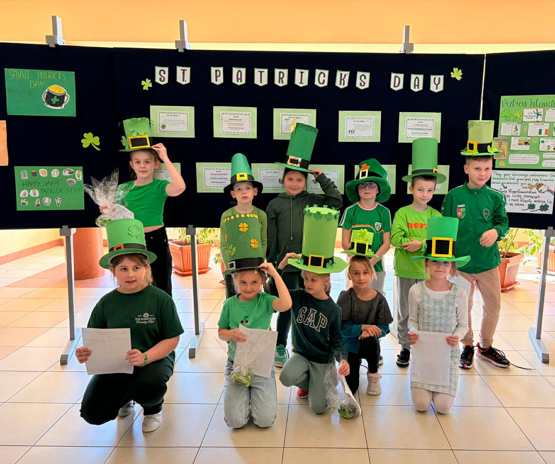 🟩Zorganizowany został konkurs na najpiękniejszy kapelusz skrzata irlandzkiego leprechauna. W rytm muzyki z zielonej wyspy uczniowie z poszczególnych klas prezentowali własnoręcznie zrobione kapelusze. Zwycięzcy konkursu otrzymali słodkie upominki w zielonych kolorach.