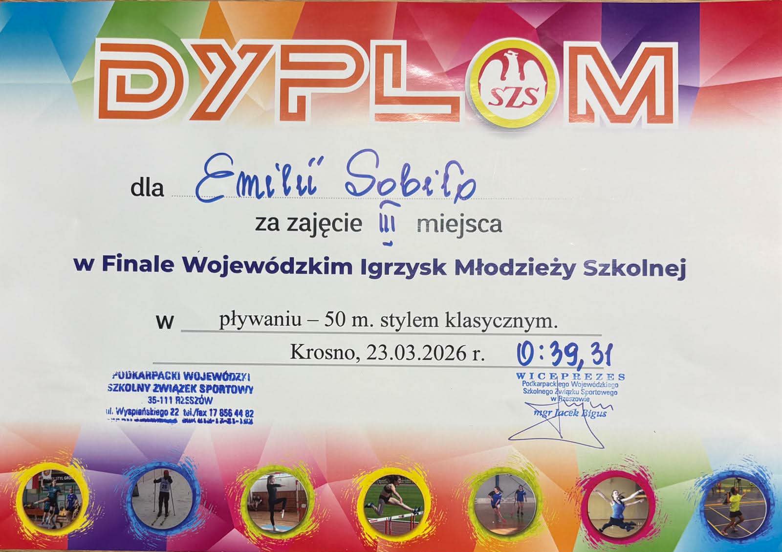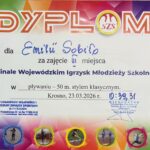 Emilia Sobiło zajęła 🥉3. miejsce w finale wojewódzkim Igrzysk Młodzieży Szkolnej w pływaniu 🏊♀️na dystansie 50 m. stylem klasycznym. Zawody zorganizowane przez Podkarpacki Wojewódzki Szkolny Związek Sportowy odbyły się 23 marca na pływalni SP Nr 14 w Krośnie. Serdecznie gratulujemy!👏💪