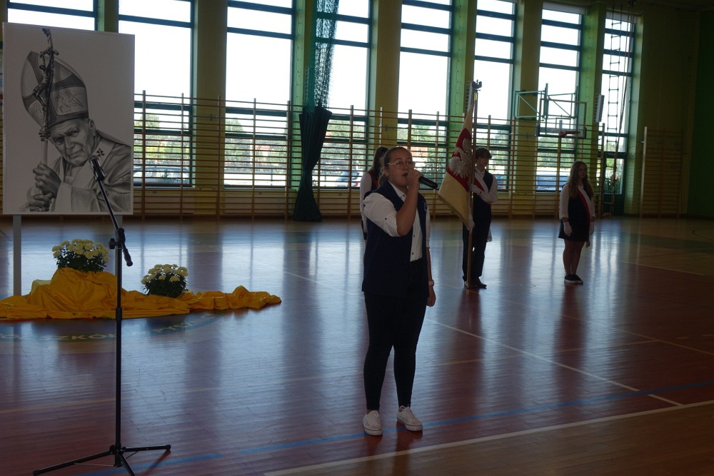 Uroczystość rozpoczęła się odśpiewaniem hymnu i wprowadzeniem sztandaru. Następnie uczennica kl. VII Zuzanna Mucha wykonała utwór „Dzielmy się miłością” nawiązujący do wydarzeń z historii Polski.
