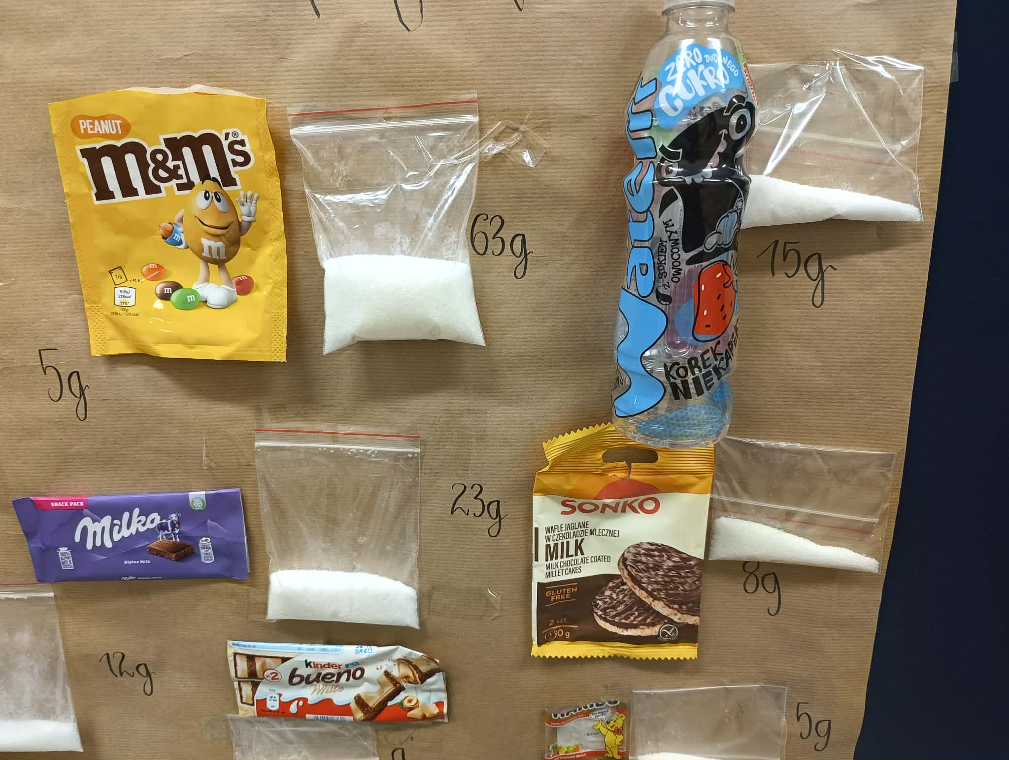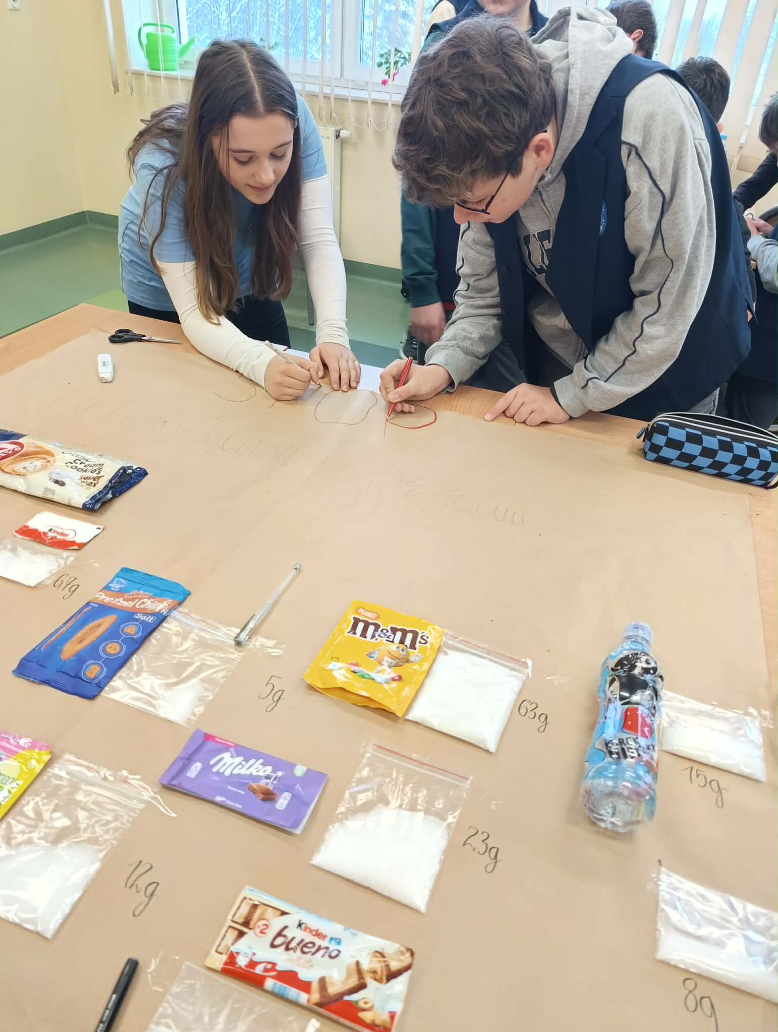 W ramach zajęć edukacji zdrowotnej uczniowie klasy 6a przygotowali szkolną kampanię profilaktyczną poświęconą nadmiernemu spożyciu cukru. W ramach działań powstał plakat pokazujący, ile cukru kryje się w popularnych przekąskach i napojach, po które sięgamy na co dzień.
