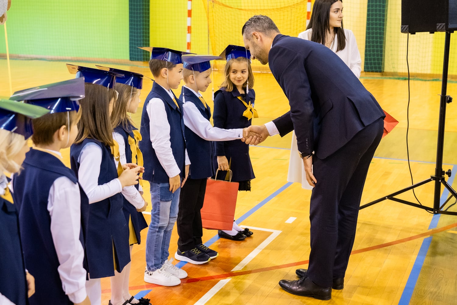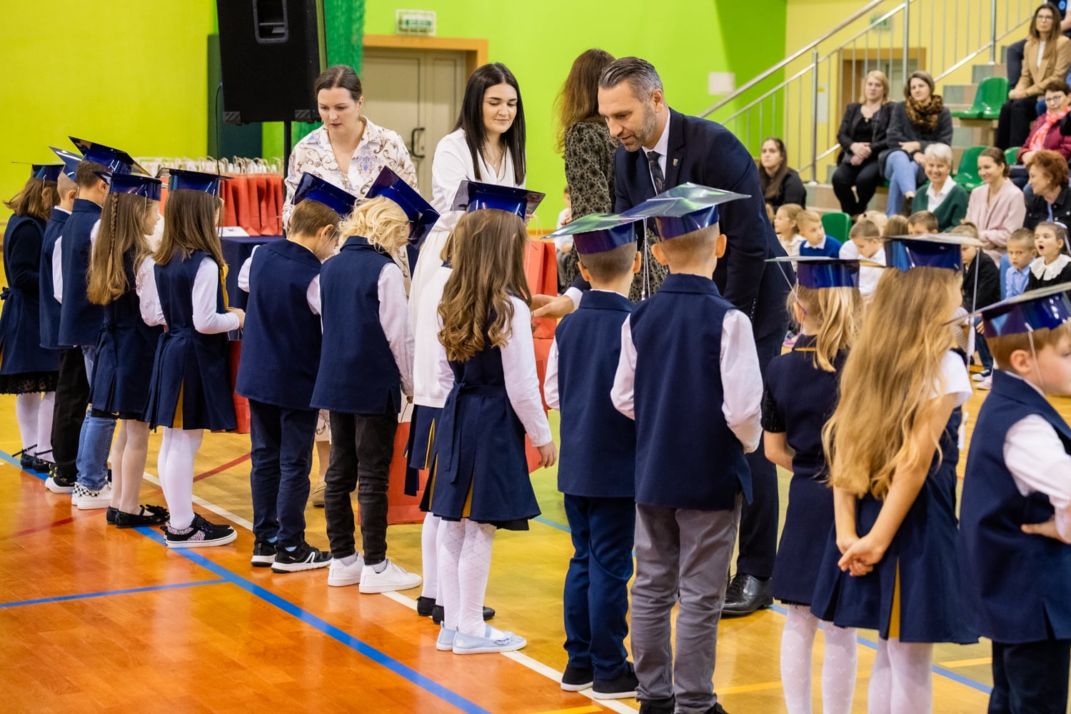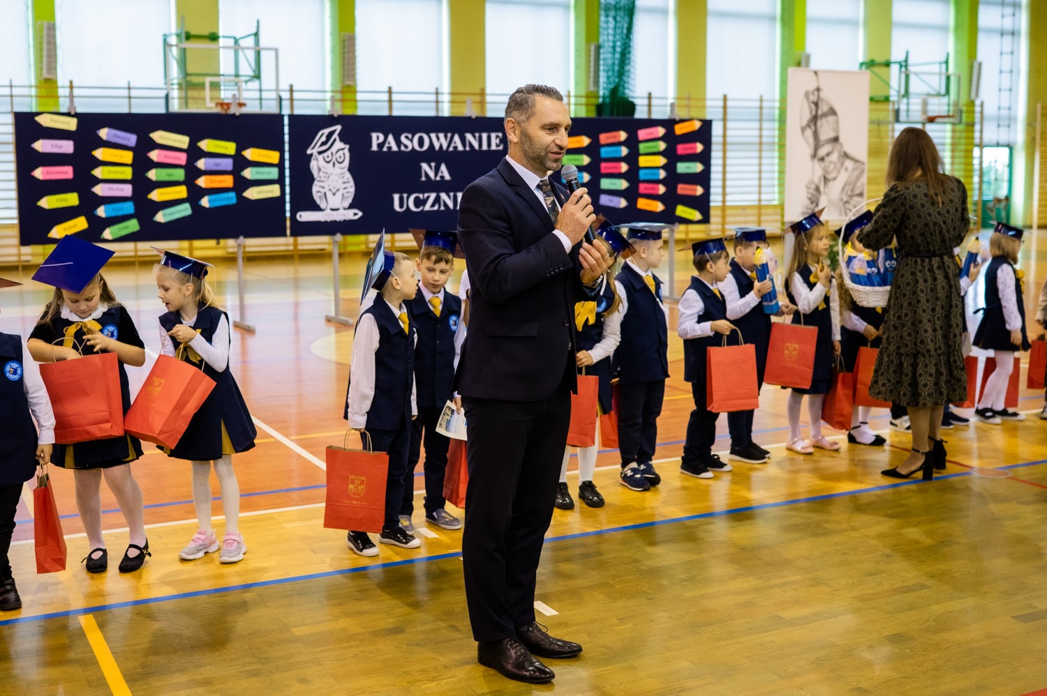 który pogratulował dzieciom udanego występu i życzył im wielu sukcesów w nauce. Następnie osobiście wręczył uczniom drobne upominki. Dzieci otrzymały również e-legitymacje szkolne oraz słodkie upominki, które sprawiły im wiele radości. Samorząd Uczniowski przygotował dla pierwszoklasistów breloczki wydrukowane na szkolnej drukarce 3D.