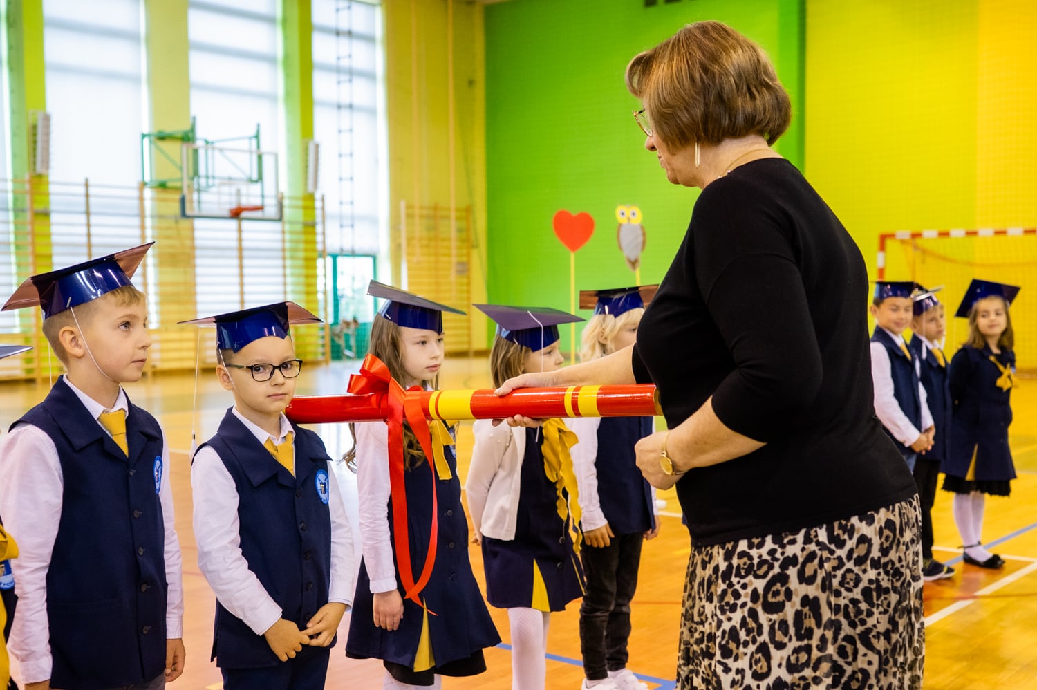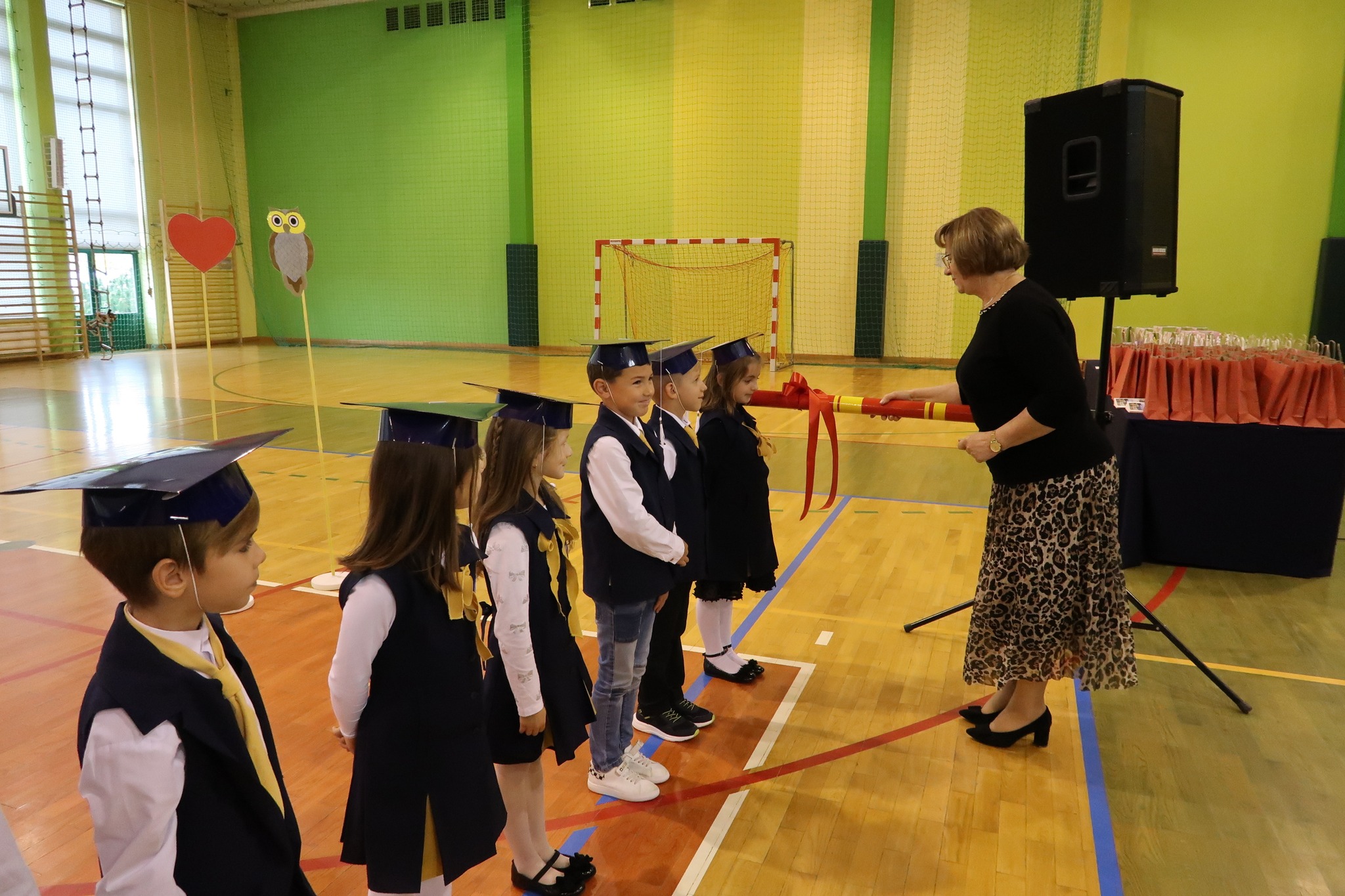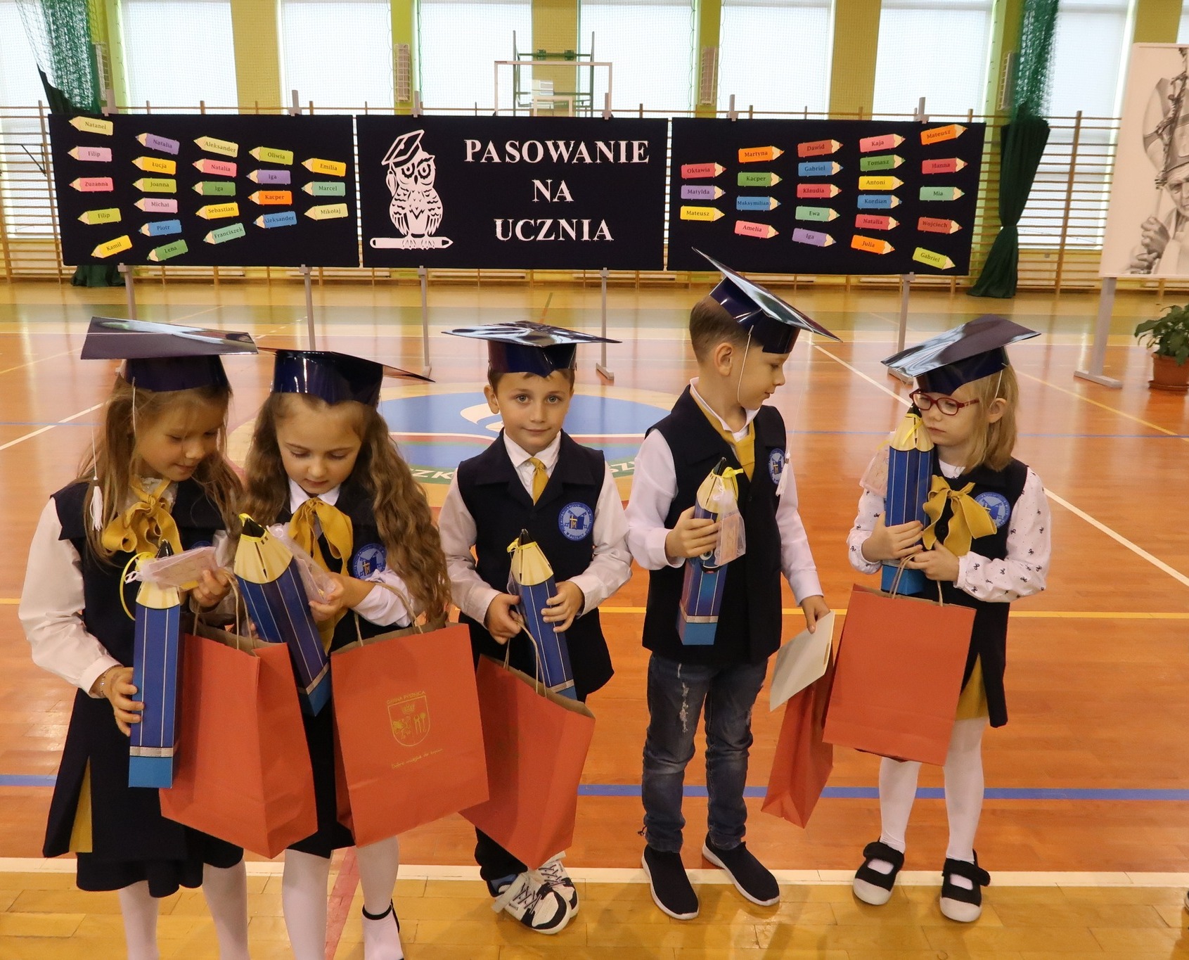który pogratulował dzieciom udanego występu i życzył im wielu sukcesów w nauce. Następnie osobiście wręczył uczniom drobne upominki. Dzieci otrzymały również e-legitymacje szkolne oraz słodkie upominki, które sprawiły im wiele radości. Samorząd Uczniowski przygotował dla pierwszoklasistów breloczki wydrukowane na szkolnej drukarce 3D.